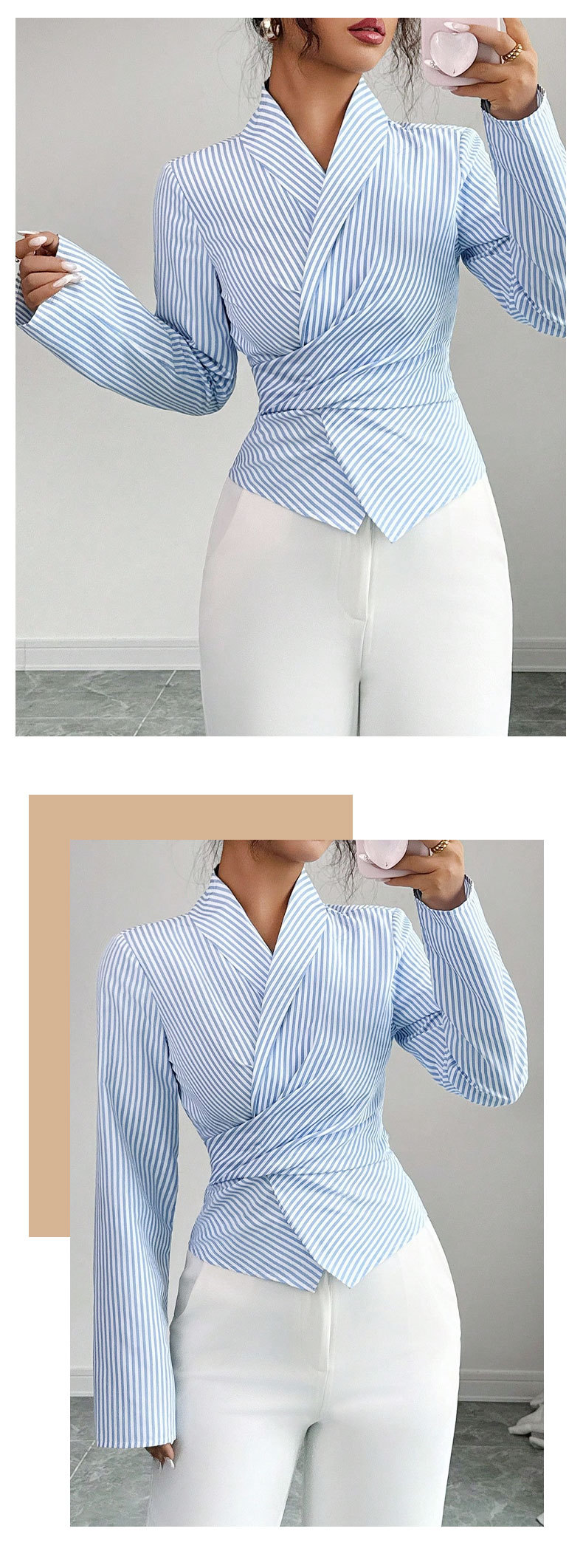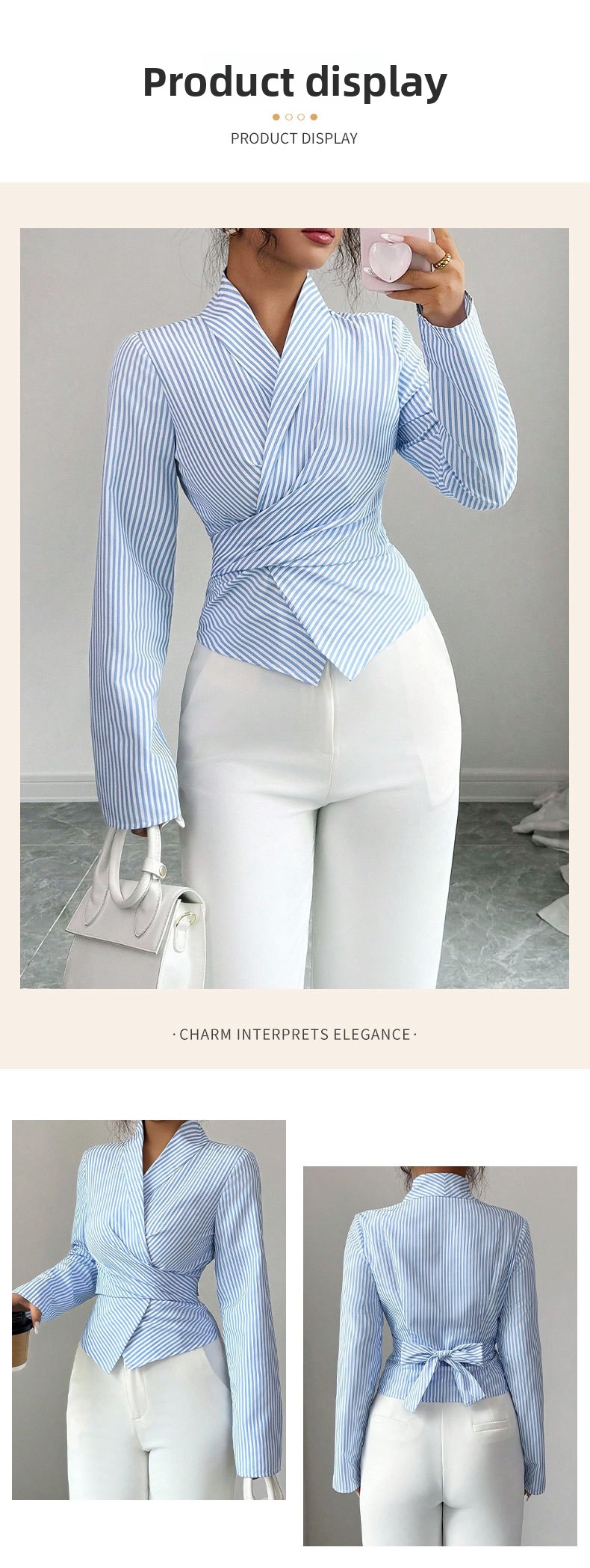 V-neck collar: Flattering neckline design that enhances feminine elegance